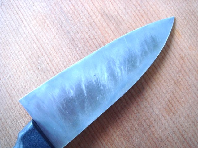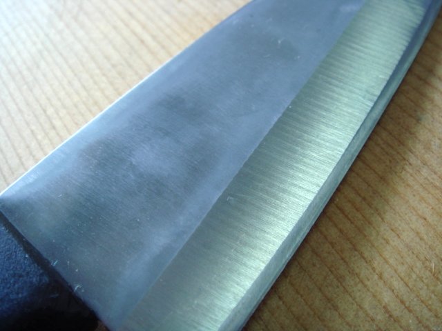 これはかなり気に入ってます。100円ショップで買った小型出刃です。元々職場で魚をさばく時用に小さいサイズの出刃が欲しいと思っていた時に見つけました。職場用なので所有包丁外ですが、100円ショップに並んでいる到底買う気になれない包丁達の中で唯一これだけは目にとまって即買いしました。買ってビックリ、出刃なのに両刃でした。粗砥で相当手間をかけ刃を落とし、片刃につけ替えました。かなり大変だったけど、今ではお気に入りです。ステンレスなのでそれほど切れは良くないけど、かなり角度をつけて研いだので、その辺の家庭の包丁よりは切れてると思います。「セリア」という100円ショップで売ってます。柄の部分は安っぽいプラスチックですが105円ですから気になってません。 |